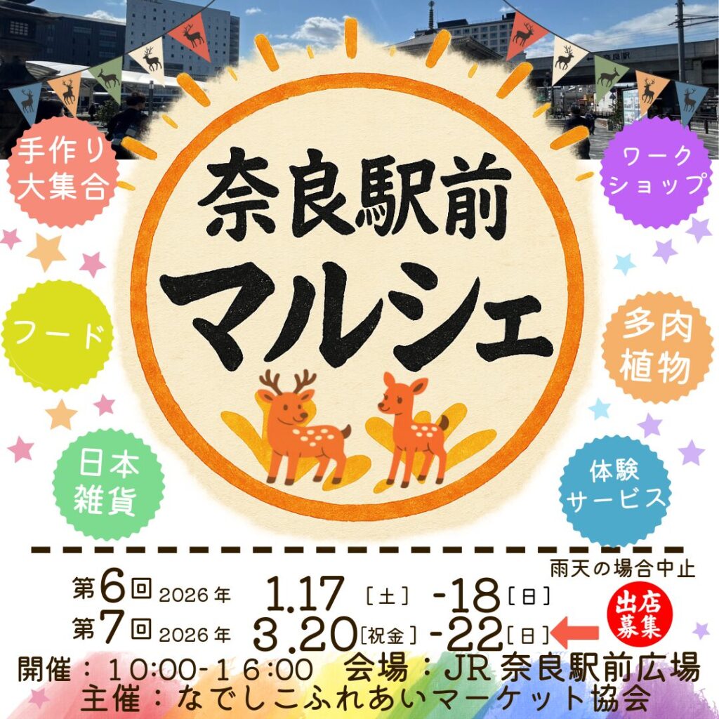 JR奈良駅前で開催する本マルシェには、手作り作家の皆さまを中心に、初心者の方から経験豊富な作家さんまで、幅広くご出店いただいています。初心者の方でも気軽に参加でき、奈良の鹿など“奈良らしさ”をモチーフにした作品づくりもおすすめです。